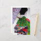 De una pintura acuarela original del artista Sacha Grossel de una geisha japonesa con un kimono de diseño verde y obi negro y rojo con un paraguas morado decorado con flores. Este diseño inspirado en Japón y Kioto está influenciado por el arte oriental y asiático y por el diseño de moda japonés tradicional.