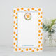 Papelería personalizada con el ilustracion de una bonita y sonriente cara de jirafa, rodeada por una corona de flores de acuarela tropical. Colorido y lindo. El fondo es un patrón con manchas caprichosas naranjas. Marco rectangular blanco con un borde azul en el centro para una escritura fácilmente legible. Personaliza tu nombre a lo largo de la parte inferior.