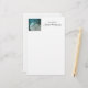 Estacionería con una fotografía de un guapo peludo y esponjoso lobo gris. En el fondo hay un bosque oscuro con árboles. Vibra mística mágica.