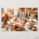 Acuarela La cena de Acción de Gracias con un pavo tostado de color dorado-marrón centrado en una mesa elegante. Luces suaves a la luz de las velas, que dejan entrever una gran variedad de postres. Una cocina acogedora con decoración rústica crea un ambiente acogedor, realzando el espíritu festivo de la reunión.
