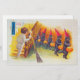 Este diseño presenta una imagen de una postal de principios del siglo XX que celebra Halloween. Muestra a un niño sosteniendo una vela que se asusta al ver un desfile de gatos negros parecidos a los humanos usando gorras de cono rojo y llevando farolillos hechos de calabazas.