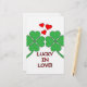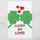 Afortunado en el amor. Dibujos de tréboles de cuatro hojas con formas cardíacas flotando sobre ellos.