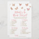 Este es un juego de ducha con mariposa rosada con el tema What's In Your Purse Bridal Shower Game. *Qué hay en tu bolso? - Los invitados recibirán puntos por cada artículo que tengan en su cartera. ¡Quien tenga más puntos, gana! mariposas rosas, marrones y rosadas, juegos divertidos, actividades, duchas de boda