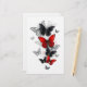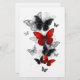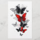 Montón de mariposas voladoras, realistas, rojas y negras morfo sobre fondo blanco con gotas de pintura.