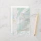 Una mujer sosteniendo el pelo hacia atrás y usando un vestido blanco sentado en una gran roca cerca del océano azul detrás de ella. Lugar falso a la derecha, papel blanco y rodeado de un borde ornamental dorado con un fondo verde azulado turquesa. Plantilla para el nombre en la parte inferior.