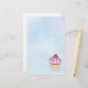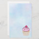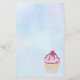 Papel de estacionería con un ilustracion de una deliciosa pastelita. Escarcha rosa y lloviznas de chocolate. Un portapapeles amarillo y una frambuesa encima. ¡Yummy!