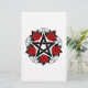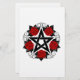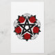 Pentagrama negro con estampado, decorado con rosas rojas florecientes con hojas sobre fondo blanco. Estilo tatuaje.