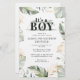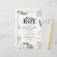 Invitación a la ducha de animales salvajes, tranquilos y elegantes chicos de safari con una jirafa, efecto dorado y hojas verdes. Perfecto para los niños invitaciones de presupuesto para la ducha de bebé