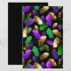 Seamless pattern of bright purple, green, and gold feathers on black Mardi Gras background. Design for the Mardi Gras holiday.