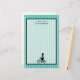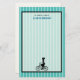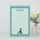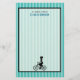 Un lindo ilustracion retro gráfico. Una silueta de una mujer con cola de caballo, vestida con un vestido y montada en bicicleta. El fondo es de rayas azul turquesa con tonos claros y oscuros alternados. Una superposición transparente con un borde negro se sienta en el centro para una escritura fácil. La parte superior dice: una nota de: (nombre). Personaliza con tu nombre.