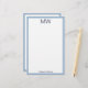 Un gran monograma azul de medianoche está en la parte superior. Una línea de texto azul de medianoche está en la parte inferior para su nombre o un mensaje de personalizado. Todo el texto se puede editar o eliminar. Esta papelería personal tiene un borde azul para bebés.