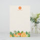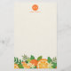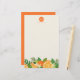 Un alegre ilustracion naranja floral. El diseño puede ser personalizado con su propio mensaje o nombre.El ilustracion incluye imágenes a mano de naranjas, rodajas, flores y hojas en colores brillantes que incluyen naranja, amarillo, verde y crema.