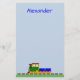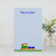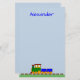 En la parte inferior de la papelería de los niños, hay un bonito tren en las vías del ferrocarril. El papel azul claro también tiene texto azul oscuro en la parte superior para el nombre del niño. Puede editar el texto negro para mostrar el nombre del niño.
