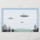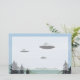 Una acuarela, pluma y tinta, y un dibujo a lápiz de color de tres OVNIs de platillo sobre las montañas.