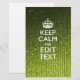 Su dicho personalizado "Keep Calm" festivo en un fino y elegante tono verde lima decorativo. Humorístico o caprichoso, pruebe con sus palabras creativas en dos líneas de texto editables. Recuerde usar LETRAS mayúsculas para obtener mejores resultados. Los diseños de bordado están disponibles en una amplia selección de opciones de colores populares.