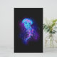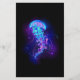 Gran medusa azul, de dibujo artístico, brillante y brillante, con largos tentáculos sobre fondo negro con bioluminiscencia violeta. Luminosas medusas.