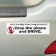 Uno de los peligros de conducir es que alguien se mete más en su conversación por teléfono que prestar atención a sus alrededores. Esta pegatina de parachoques dice audazmente dejar el teléfono y prestar atención a la carretera. Los conductores que se desvían pueden causar accidentes graves. Un agradable recordatorio para todos de que llegar en una pieza es mucho más importante que una conversación casual por teléfono.