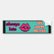 ¡Esta bonita pegatina de parachoques está hecha especialmente para el final de moda! En una letra negra audaz delineada en rosa, la pegatina del parachoques proclama "siempre tarde" seguida de "pero vale la pena esperar" en un texto amarillo brillante. Entre las dos frases se encuentra un ilustracion de labios para añadir un toque más suave. ¡Pide el tuyo hoy por ese amigo que siempre parece aparecer unos minutos tarde!