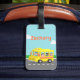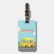¡Una etiqueta linda del equipaje de los niños con el ilustracion de un autobús escolar amarillo con los niños felices que se excitan para ir a la escuela! Fondo del cielo azul y de las nubes blancas. Personalice con el nombre del niño para hacer un pedazo decorativo lindo para el poco su bolso de escuela.