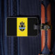 Etiqueta del equipaje con bandera de la ciudad de Pittsburgh, Pennsylvania; bandera con tres bandas verticales de negro y amarillo con ilustracion de castillo y escudo en el centro