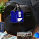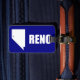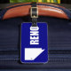 Etiqueta del equipaje con bandera de la ciudad de Reno, Nevada; bandera azul con forma blanca de Nevada con estrella que simboliza la ubicación de Reno dentro del estado