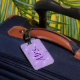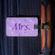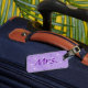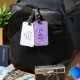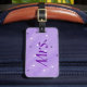 Pintura de estrellas moradas y blancas sobre un fondo de lavanda mezclado, con la señora impresa en la parte delantera de las etiquetas del equipaje. Hay un marcador de posición para el nombre y la dirección en la parte posterior.