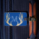 Este diseño presenta un fondo azul con antineos de ciervos y un monograma de grunge en un lado y nombre y dirección en el otro lado.