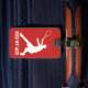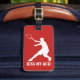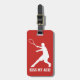 Etiquetas de encargo del equipaje del viaje del regalo del jugador de tenis. Etiquetas personalizadas del equipaje para la maleta o el bolso. Diseño moderno de la silueta de jugador que golpea una bola como tiro de paso del cuarto delantero. Añada su propio nombre, monograma, cita divertida y dirección en la parte posterior. Ejemplo: ¡Bese mi as! Refresque la idea del regalo de la fiesta de cumpleaños de los deportes atléticos para el jugador de tenis, el equipo, el coche, el instructor, el hijo, el hermano, el papá, el padre, la mamá, la hermana, el nieto, el amigo, el primo, el fan, el personal del club, el jefe, el trabajador del co, el empleado etc. conveniente para los adultos y los niños. Color de fondo rojo adaptable. Incluye la correa de cuero. También disponible con la ranura para su propia tarjeta de visita.