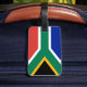 Etiqueta del equipaje con correa de cuero con bandera de la República de Sudáfrica; bandera roja, blanca, verde, amarilla, negra y azul