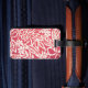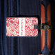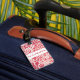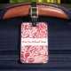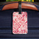 Etiqueta de equipaje personalizada mostrada con una divertida impresión hawaiana de color rojo con texto. Personalice esta etiqueta o cómprela tal como está.