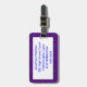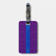 Una etiqueta de equipaje acrílico de doble cara con un patrón de formas ogras tradicionales en tonos violeta y azul. La correa está en cuero.
