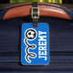 Etiqueta de equipaje personalizado con fútbol deportivo. Idea de regalo personalizada para el equipo de fútbol masculino. Etiquetas de identificación útiles para las bolsas.
