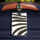 La pintura de rayas de cebra en blanco y negro decora la parte delantera de estas etiquetas de equipaje. En la parte posterior se ha impreso un cuadro de cebra de tamaño completo en una escala menor. Hay un marcador de posición de plantilla en la parte posterior para el texto personalizado.