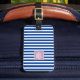 Etiqueta de maleta preppy con fondo pastel en un color de su elección con rayas y un monograma de tres partes en un soporte de monograma de color. En el reverso se mantiene la información en una fuente sans serif sobre un fondo blanco.
