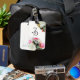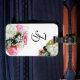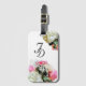 El diseño presenta un fondo blanco para las imágenes realistas de flores rosas y blancas. Las iniciales que proporciona se muestran en un elegante tipo de letra negro. ¡Nunca más confundas tu equipaje!