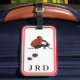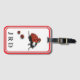 El diseño muestra la imagen de una mariquita escoltando a los niños ladybugs enmarcado por un borde rojo, blanco y negro y mostrado contra un fondo blanco. Las iniciales que proporciona se muestran en la parte inferior de un tipo de letra impreso en negro. Este diseño es claro y fácil de leer, y le ayudará a identificar su equipaje.