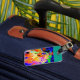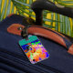 Etiqueta colorida del equipaje de Darcy en trullo.