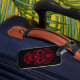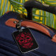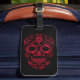 Esta es una imagen de un cráneo rojo con fondo negro en una etiqueta de equipaje
