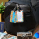 Una etiqueta de doble cara, de acrílico bonita del equipaje con por todas partes un modelo de flores rojas, anaranjadas, amarillas en un fondo brillante de la turquesa, de un collage de papel pintado a mano de Judy Adamson. La correa está en cuero.