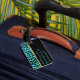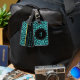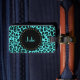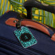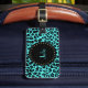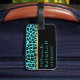 Etiqueta de encargo bonita del equipaje hecha en una turquesa y un estampado leopardo negro. Los gráficos de un disco circular negro, en el centro, tienen texto de la turquesa listo para personalizar. La parte posterior se hace en negro sólido, en la parte inferior y los gráficos de un modelo del leopardo de la turquesa, en el top. Personalice el texto, en el frente y la parte posterior. Etiqueta de moda para el equipaje, las mochilas, o los monederos.