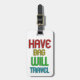 La parte posterior de las características del este diseño del personalizable una silueta blanca de un aeroplano en un fondo negro. ¡Añada su nombre al texto para personalizar esta etiqueta del equipaje! El frente de este texto colorido de las características del diseño de la moda que lee: "Tenga bolso viajará". ¡Esta etiqueta única del equipaje hace un gran regalo para ese asistente o piloto de vuelo en su vida!