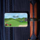 Destacar en el carrusel de equipajes con una etiqueta de equipaje de golf que cuenta con un fondo de campo de golf con una trampa de arena y una bandera de golf, un carrito de golf rojo, un carrito de golf azul con bolsas de golf. Texto estilizado es Golf. El texto está configurado para su nombre, dirección y número de teléfono o cualquier texto que desee. Perfecto regalo para el golfista en su vida! Correa para equipaje de cuero incluida.