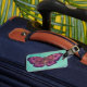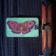 Mariposa acuarela pintada a mano, en tonos violetas, con acentos marrones oscuros. Envuelto en un fondo contrastante en tonos verdes, con toques de amarillo y azul