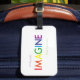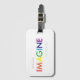 Encuentra tu maleta rápidamente con una etiqueta para el equipaje del personalizado. Esta muestra las eternamente hermosas palabras de John Lennnon - "Imaginen a toda la gente viviendo en paz". Utilizando los colores de un arcoiris, las letras se hacen en un tipo de letra fácil de leer. El diseño aparece de un lado mientras que el otro es para su tarjeta de visita o información de identificación personal. La etiqueta está hecha con acrílico ultra duradero y viene con una correa de cuero. Siéntase libre de contactarme a través de Zazzle si puedo ayudar con este artículo.