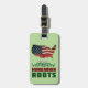 Personalizar fácilmente estas etiquetas de equipaje haciendo clic en los cuadros de texto situados en el lado derecho del diseño. Diseño de Raíces Húngaras, con un mapa de Estados Unidos con banderas húngaras y norteamericanas.