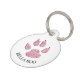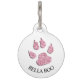 Huella de garra con brillo rosa y nombre del perro en el frente con fondo blanco, en la parte posterior fondo de alerta roja con texto blanco que dice ¡OH Snap! Estoy Perdido - Llama a mi Mamá, Ella está llorando de tristeza. El fondo rojo llama la atención de la placa para que quien encuentre al perro se asegure de ver la alerta.