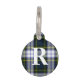 Placa de identificación con monograma de la diversión con el frente hecho en el verde, el azul, el blanco, y el modelo de la tela escocesa del vestido de Gordon del negro, con un monograma grande de la letra del blanco uno. La parte posterior de la etiqueta se hace en azul, con el texto blanco. Personalice el monograma y el texto en de nuevo a juego sus necesidades.