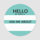 "Hola, mi nombre es" escribe en la etiqueta de nombre con un segundo espacio para "Pregúntame sobre". El invitado del evento puede escribir en su nombre y algo sobre ellos mismos para iniciar una conversación. El fondo verde azulado claro se puede cambiar a cualquier color que desee y todo el texto se puede editar. Ideal para reuniones, eventos de trabajo en red, fiestas.