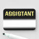 Este audaz diseño de placa de estilo de etiqueta de borrado en seco para voluntarios incluye el mensaje "ASSISTENTE". También incluye un área donde el nombre de un voluntario podría escribirse usando un marcador de borrado seco. Una insignia de estilo de etiqueta de nombre como esta podría ser usada para mostrar que una persona es voluntaria o asistente autorizada en un evento. [~Z0000359]