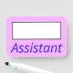 Este sencillo diseño de placa de estilo de etiqueta de borrado en seco reutilizable para voluntarios incluye el mensaje "Ayudante". También incluye una sección en la que se puede escribir el nombre de un voluntario o asistente utilizando un marcador de borrado en seco. Una insignia como esta puede ser usada para indicar que una persona es voluntaria o asistente oficial en un evento. [~Z0000359]